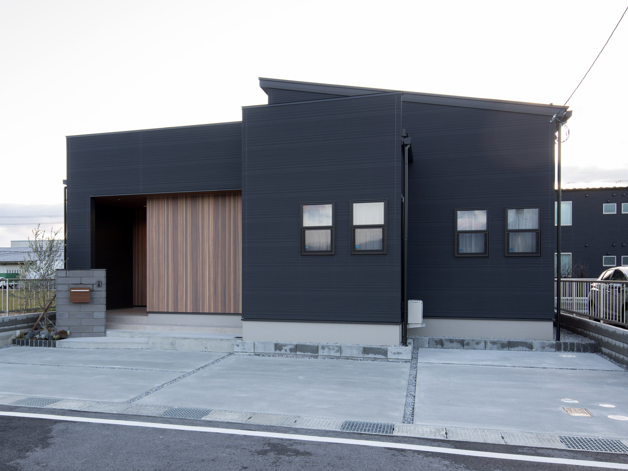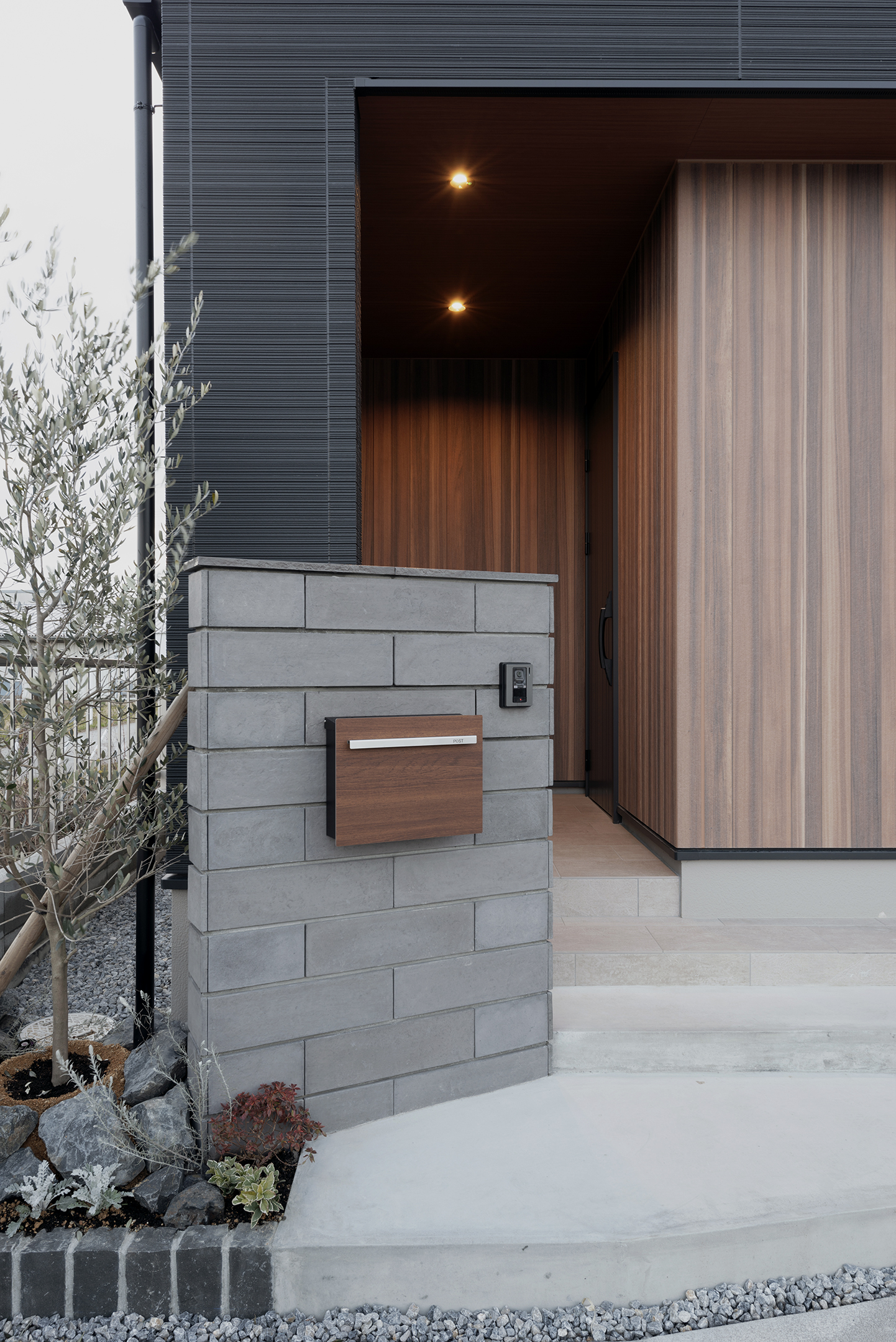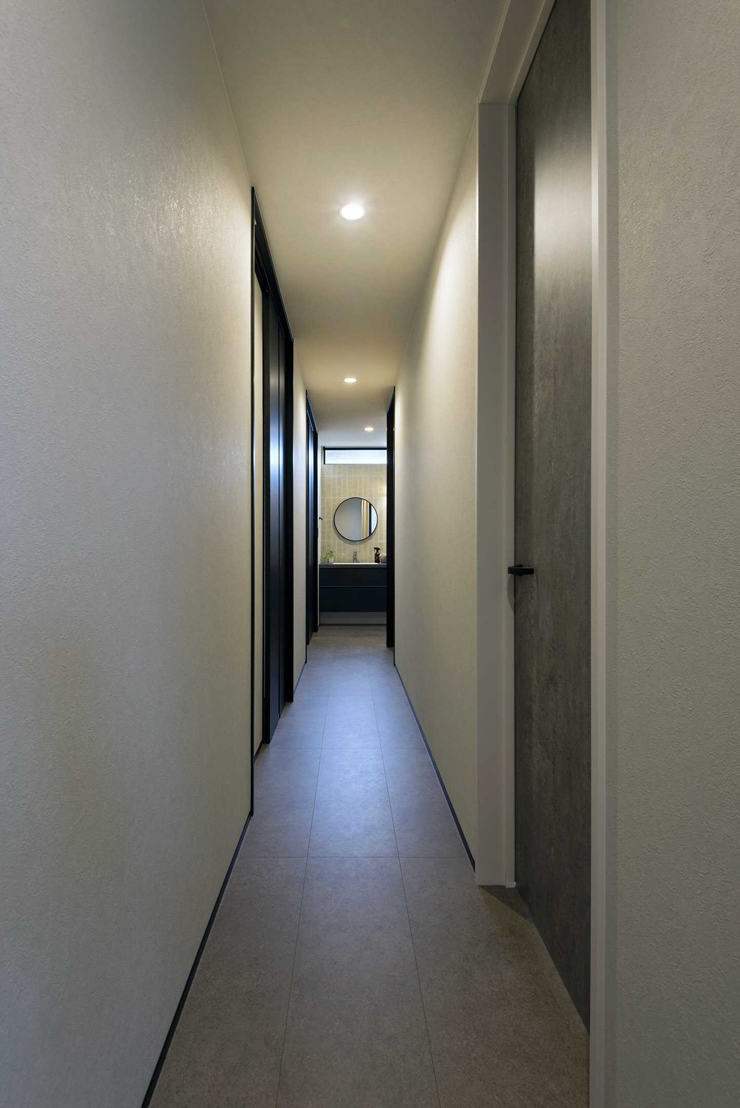 落ち着いたグレーの塗り壁が優しく迎える、洗練された空間。玄関正面には石目調のタイルを採用し、テクスチャーの対比が奥行きを生み出します。ブラックの収納キャビネットがモダンなアクセントとなり、間接照明が上質な雰囲気を演出。