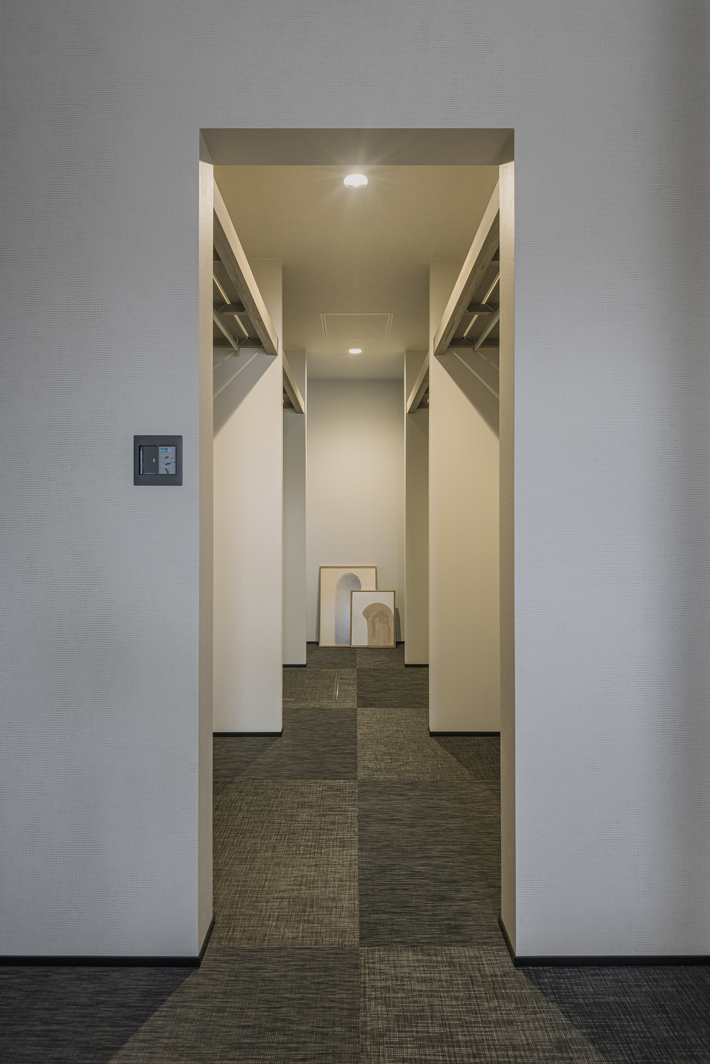 充実した収納力を備えたウォークインクローゼット。寝室から直接アクセスできる動線で、日々の生活がより快適に。寝室から繋がるフロアは柔らかな足触りで、両サイドの棚がたっぷりと収納スペースを確保。衣類やシーズン品を効率よく整理でき、シンプルで使いやすい空間設計になっています。