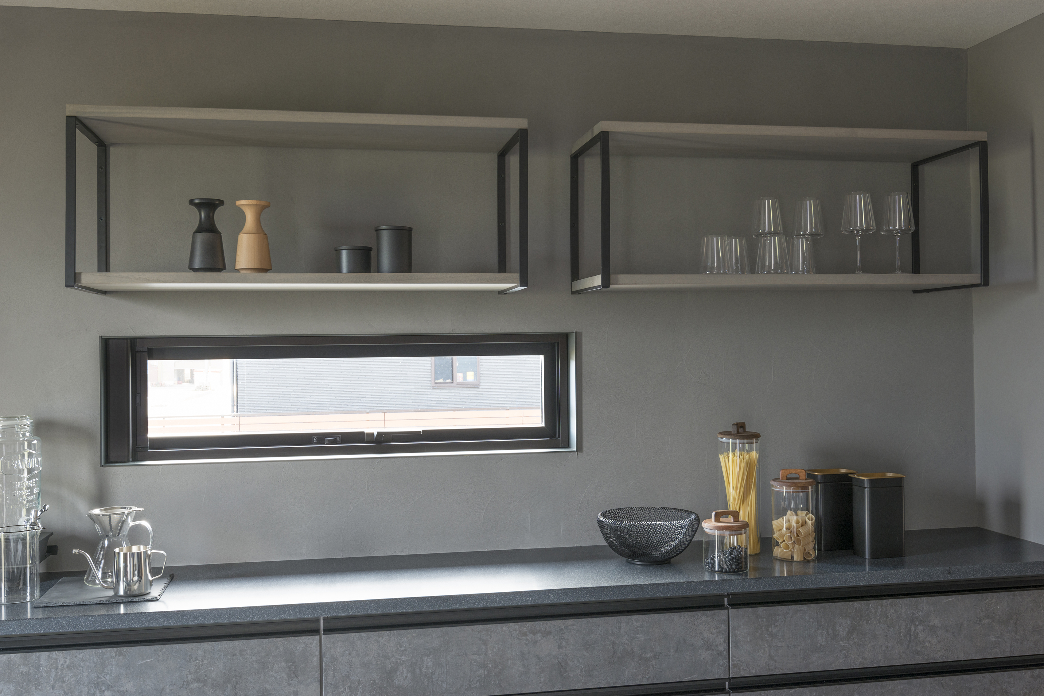 落ち着いたグレーの壁面とブラックのアクセントが織りなす洗練されたキッチンエリア。ハイカウンターのカップボードは収納力と機能性を兼ね備え、日常の調理をスムーズにサポート。継ぎ目のないフルフラットキッチンがホテルライクな上質感を演出。ペンダント照明が優しく空間を照らし、食事の準備から片付けまでをエレガントな雰囲気で楽しめる、デザイン性と実用性を両立した理想的なキッチン空間です。
